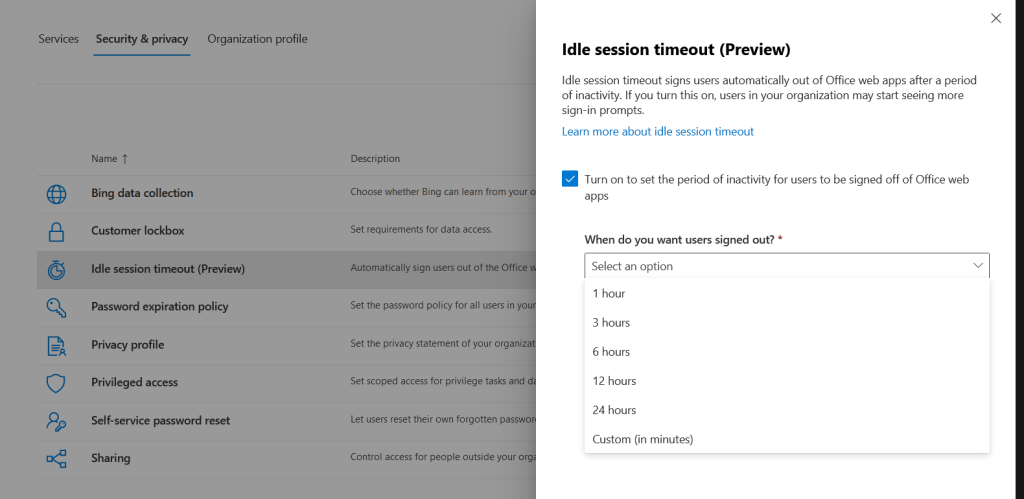 To enable this feature, open the following link, or go to Settings -> Org setting -> Security & privacy -> Idle session timeout (Preview).