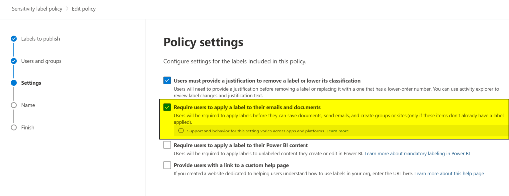 Then click “Edit policy” and go straight into “Settings”. Select “Require users to apply a label to their emails and documents”, then save the label policy.