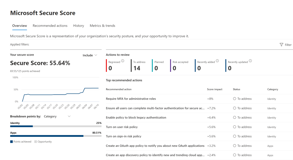 The Microsoft Secure score is a useful page to get an idea of the general improvement areas you should monitor and approach in your tenant.