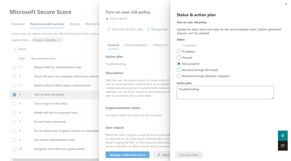 If it didn’t, or you are in a hurry, click on the recommended action, “Edit status & action plan”, and resolve the suggestion as risk accepted, then wait for the score to update. Once you see that the full points are awarded, revert the change. This procedure should “force” the sync to grant you full points, then change it with the actual value.
