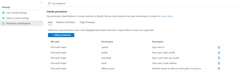 If you have selected earlier Allow user consent for apps from verified publishers, for selected permissions, under “Permission classifications” on the left, you’ll be able to customize permissions that users can approve without admin requests.